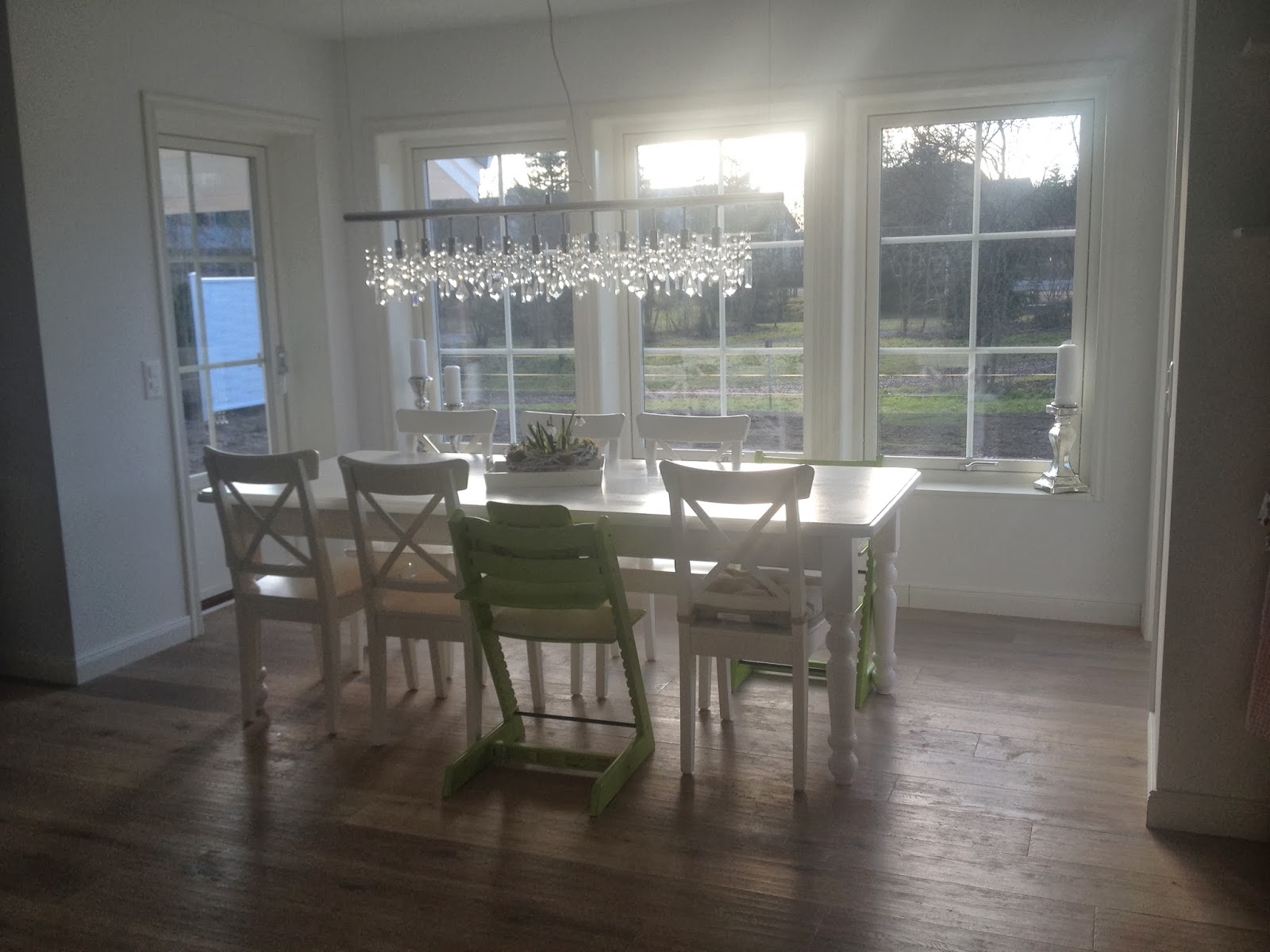 Aber wir geniessen es ungemein, dass wir hier den ganzen Tag über Sonne haben, die Lampe hätten wir fast weglassen können, so selten wird sie tatsächlich gebraucht. Das sind wir uns gar nicht gewöhnt, haben wir vorher doch in einem Reihenmittelhaus gewohnt, in dem das Esszimmer in der Mitte lag und man auch bei strahlendem Sonnenschein die Lampe einschalten musste, wollte man wissen, was da auf dem Teller lag;-)